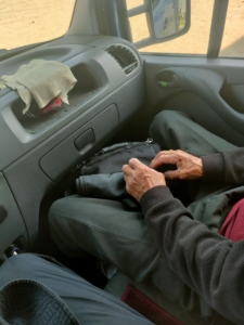 助手席で爺さんの股の下に荷物。小されたらたまったもんじゃない。